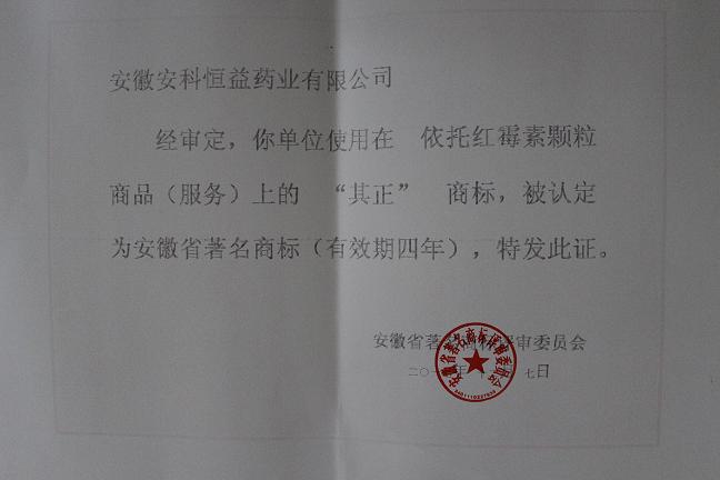 近日,公司收到《2017年安徽省著名商標(biāo)認(rèn)定公告》,公司產(chǎn)品依托紅霉素顆粒其商標(biāo)“其正”經(jīng)安徽省著名商標(biāo)評審委員會(huì)評審?fù)ㄟ^,認(rèn)定為“安徽省著名商標(biāo)”。該商標(biāo)是我公司取得的第三件省著名商標(biāo)(前兩件分別是“天井”牌氨咖黃敏膠囊、恒迪克牌頭孢克洛分散片)。
