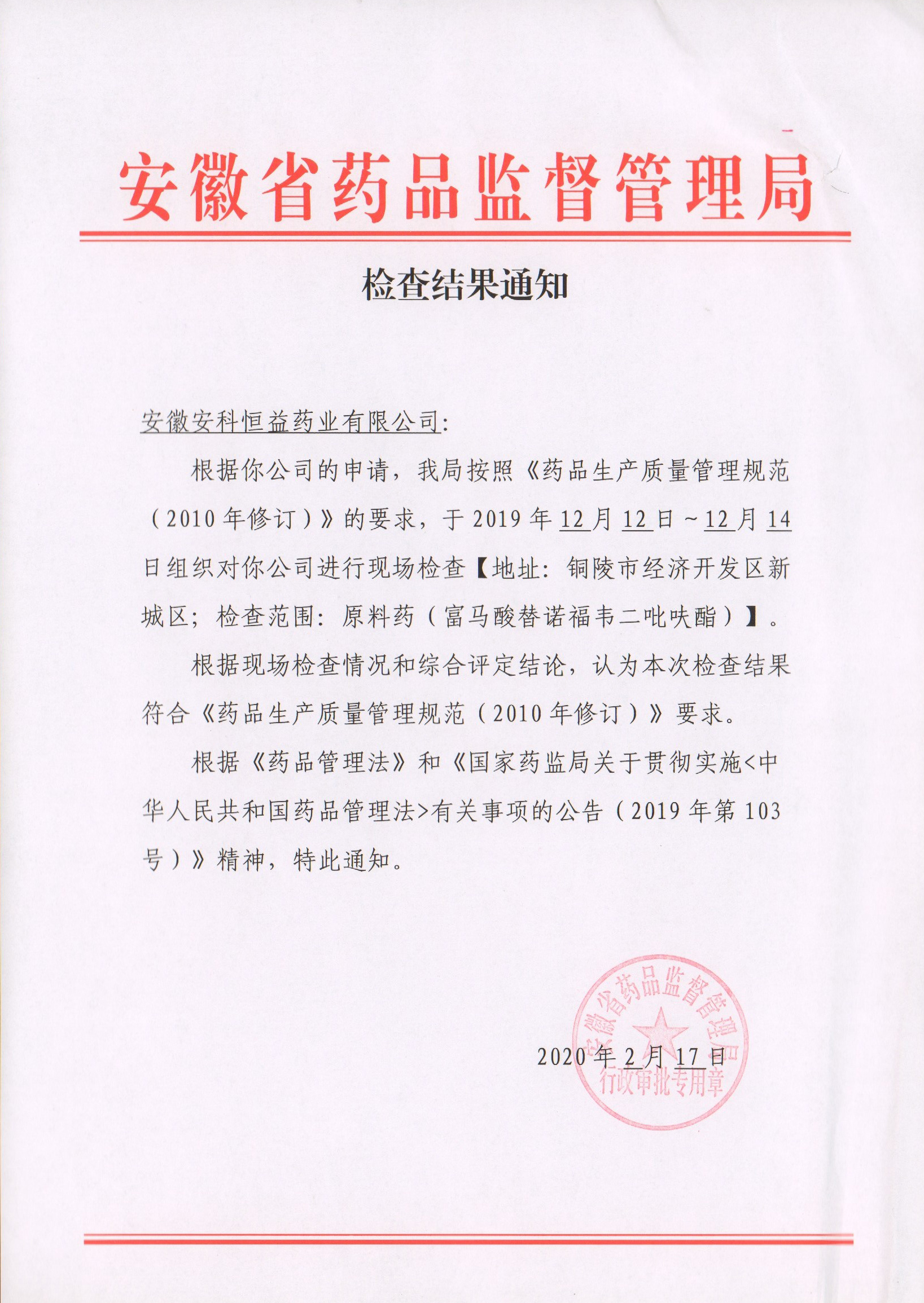 2020224日,公司收到安徽省藥品監督管理局頒發的《檢查結果通知》,我公司原料藥(富馬酸替諾福韋二吡呋酯)通過安徽省藥品監督管理局組織進行的藥品GMP現場檢查,檢查結果符合《藥品生產質量管理規范(2010年修訂)》的要求。